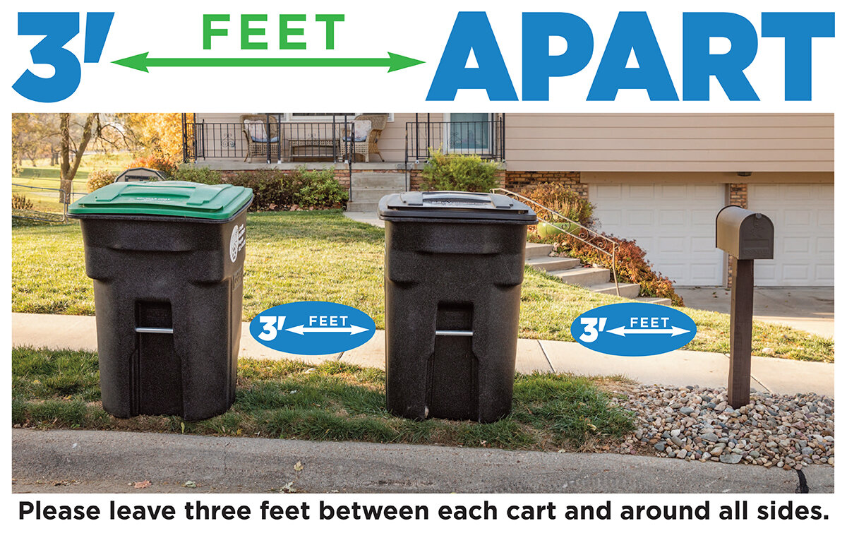 Please have your cart(s) out for collection by 6 a.m. on your designated collection day. Place the carts directly at the curb or roadway, ensuring they are at least three feet apart from each other and from any obstacles (such as trees, mailboxes, lamp posts, or parked cars) so the truck’s mechanism can reach each cart. The cart handle should face your house.